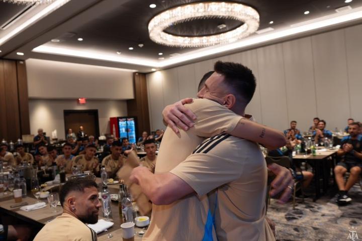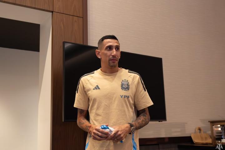 阿根廷队官方发布的照片中,迪马利亚领取了一件印有“GRACIAS FIDEO(Fideo为迪马利亚昵称)”的球衣,梅西还与迪马利亚拥抱致意。