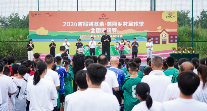 中国足球协会主席宋凯、北京市足球运动协会主席刘军、中国足球发展基金会工作助理于航、华彬集团执行总裁郑刚、姚基金姚挚友代表王军霞、姚基金创始人姚明、姚基金秘书长叶大伟等共同出席2024首届姚基金美丽乡村足球季全国邀请赛开幕式。