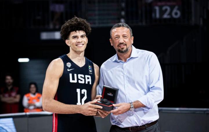 卡梅隆-布泽尔今年16岁,在不久前结束的U17男篮世界杯系列赛,7场比赛他场均出战20.1分钟贡献20.1分9.9个篮板2.0次助攻和2.7次抢断,并最终成功当选本届赛事的MVP。作为球队核心,他带领美国U17男篮场均得分达到128.6分,场均净胜分则为恐怖的64.3分。