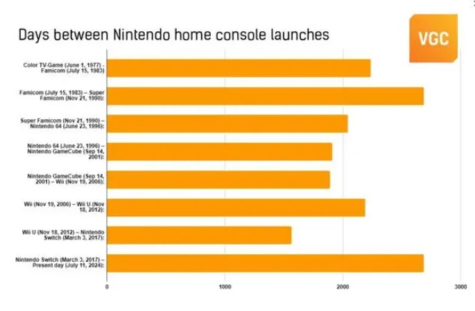以下是任天堂主机发布间隔天数统计,使用了每款主机的全球首次发布日期,不包含结束日期。