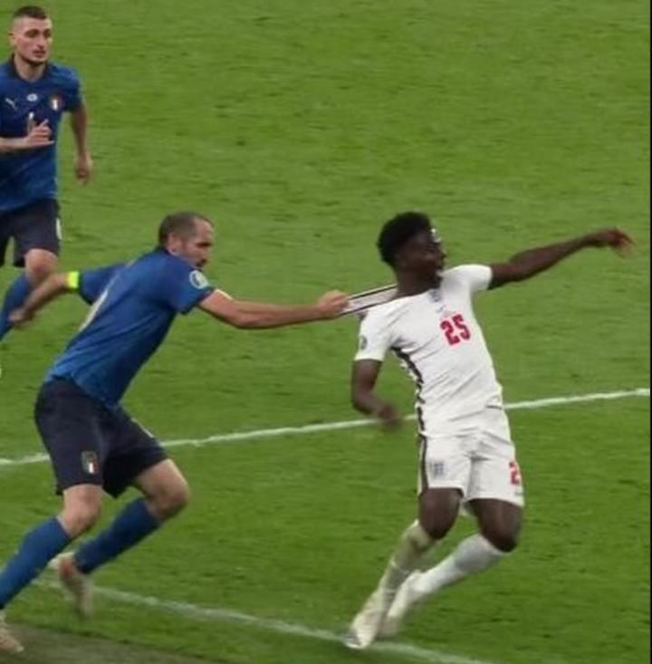 回顾2020年欧洲杯决赛英格兰对阵意大利的名场面,少不了基耶利尼拉拽萨卡。