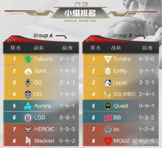 胜者组晋级战队:Falcons、Spirit、GG、OG、Tundra、Entity、Liquid、XG.WBG。