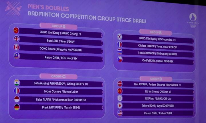 巴黎奥运会羽毛球男双分组抽签仪式结束,头号种子梁伟铿/王昶与世锦赛冠军、马来西亚组合谢定峰/苏伟译分在一组,刘雨辰/欧烜屹进入5对组合的死亡小组。小组前两名晋级淘汰赛。