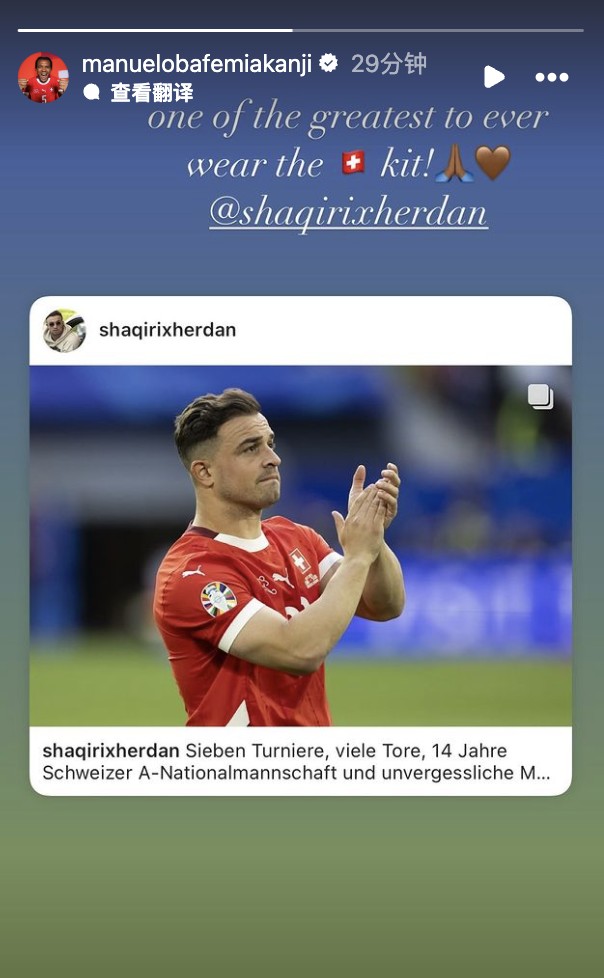 阿坎吉告别沙奇里:瑞士队最好的球员之一来杯冰可罗 @懂球帝2024-07-15 22:13不久前,32岁的中场球员沙奇里在个人社交媒体上宣布,自己将退出瑞士国家队,结束14年国家队生涯。对此,瑞士国脚阿坎吉更新了个人社媒,和自己的前辈告别。不久前,阿坎吉在社媒转发了沙奇里的动态,配文道:“瑞士队最好的球员之一。”在14年间,沙奇里共代表瑞士队出战125场比赛,打进32球、送出34次助攻。本届欧洲杯1/4决赛,瑞士队被英格兰队淘汰出局,这是他代表瑞士国家队出场的最后一战。展开更多
