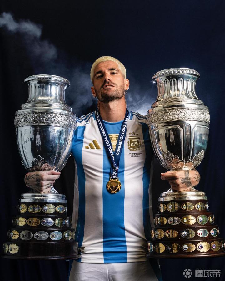 在成功卫冕美洲杯冠军后,阿根廷中场德保罗在社交媒体晒出手捧两座美洲杯冠军奖杯的照片。