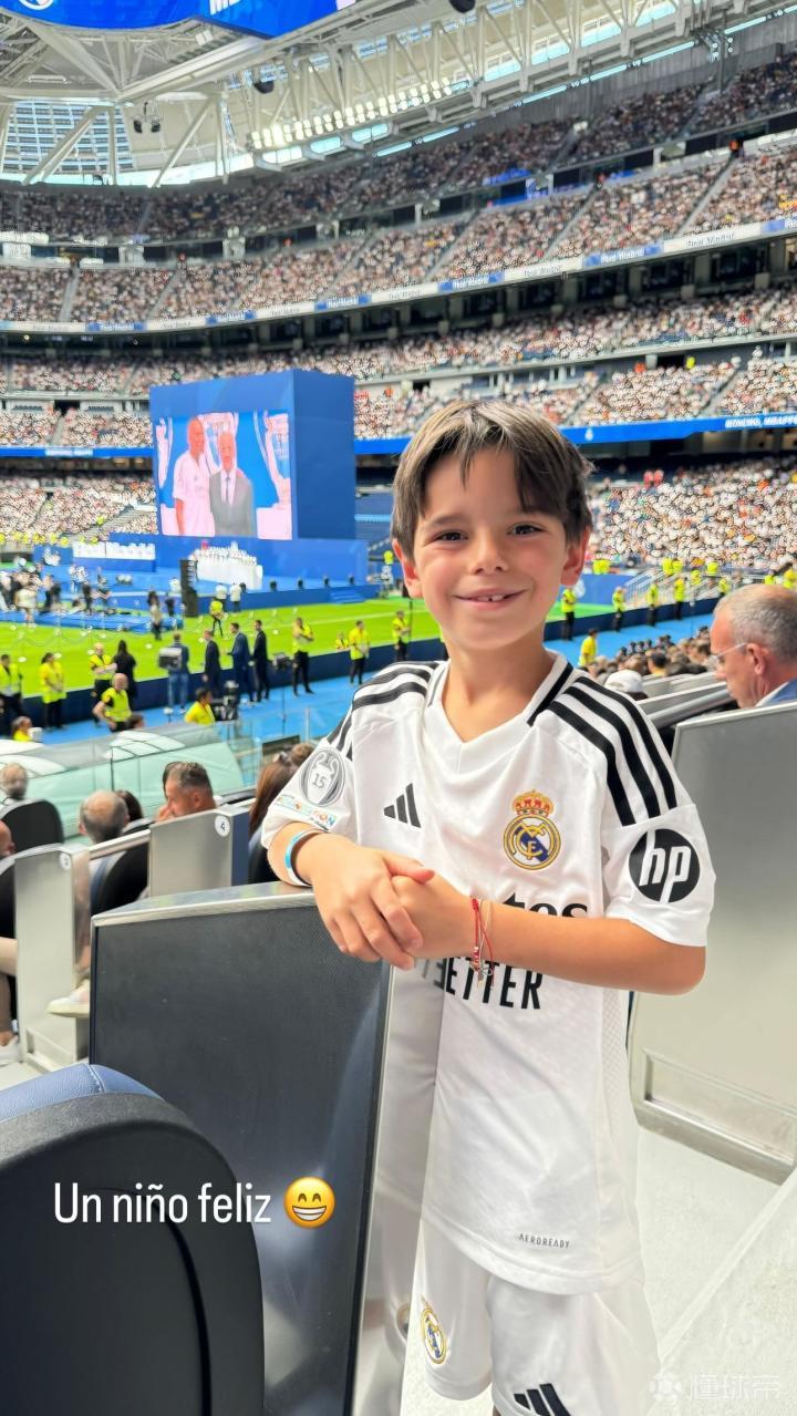 库尔图瓦晒出他的儿子身穿整套皇马球衣在伯纳乌现场观看姆巴佩亮相的照片,配文:“一个开心的孩子。”