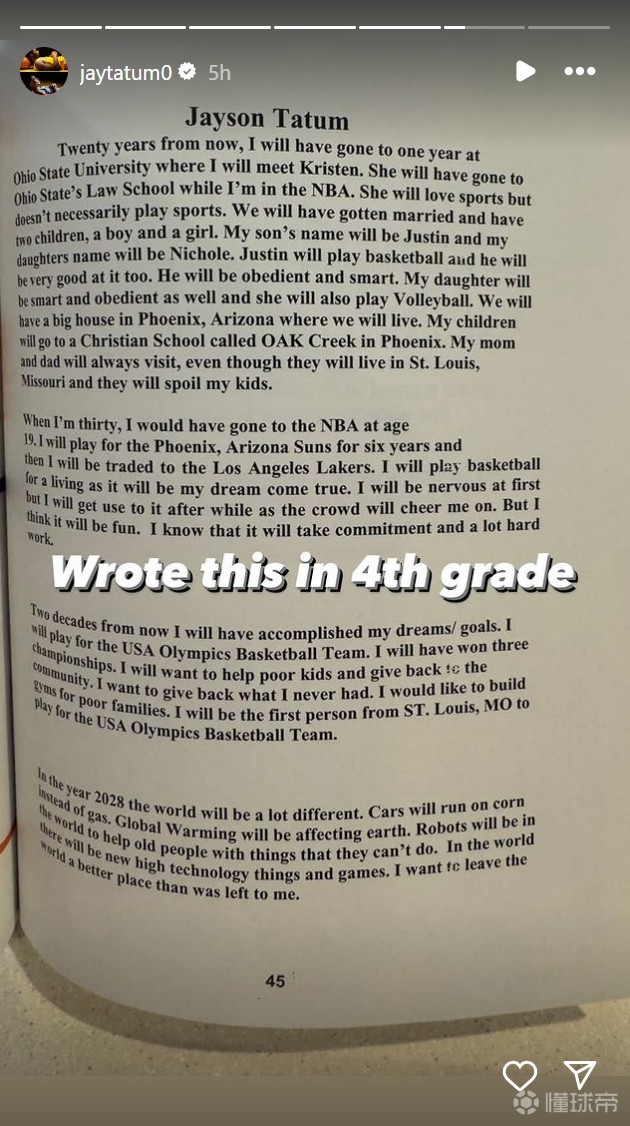 北京时间7月17日,凯尔特人球星塔图姆在社媒分享了一篇自己四年级时写的作文,文章的内容是他对未来的畅想。