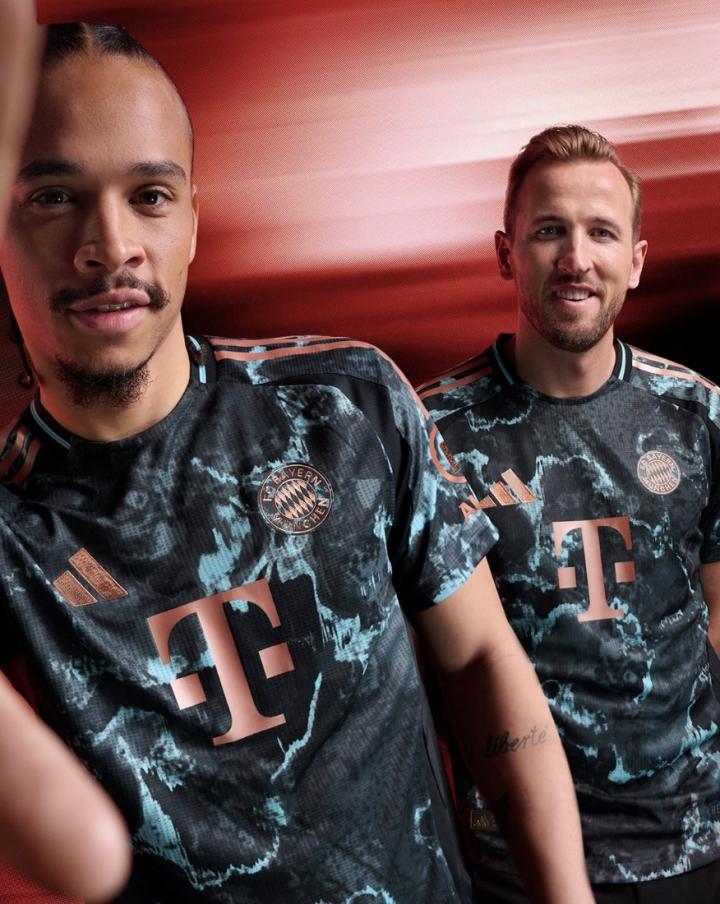 拜仁官方在社交媒体上晒出了2024/25赛季的客场球衣,由前锋萨内、哈里-凯恩身着球衣出镜。