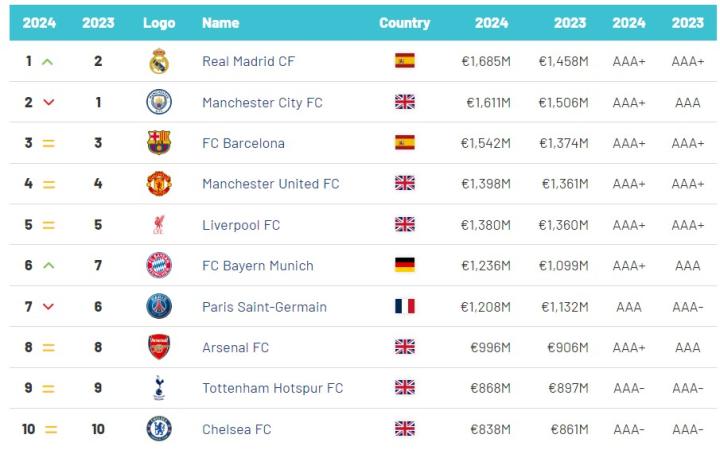 Brand Finance2024最具价值俱乐部排名:皇马居首,曼城第二
