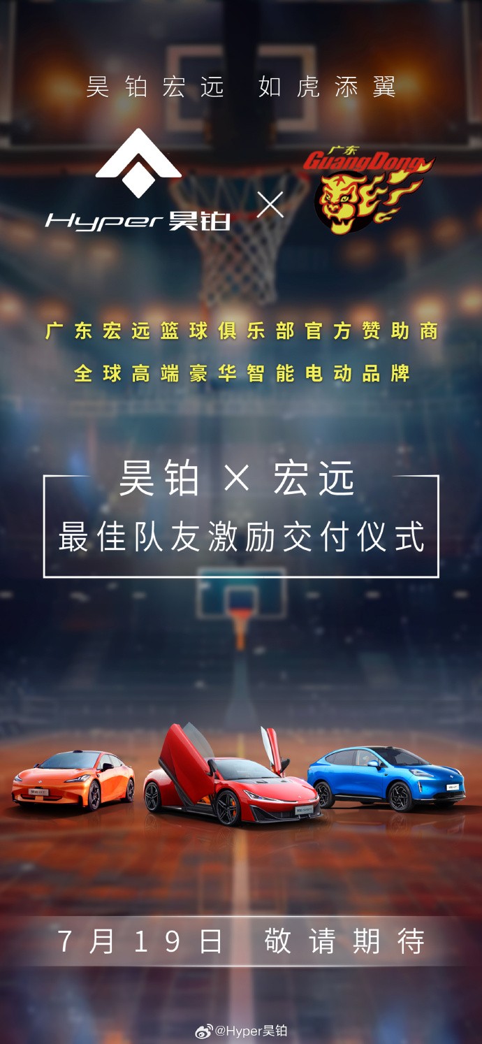 北京时间7月17日,昊铂汽车官方宣布与广东宏远队交付仪式,定于7月19日正式举行。