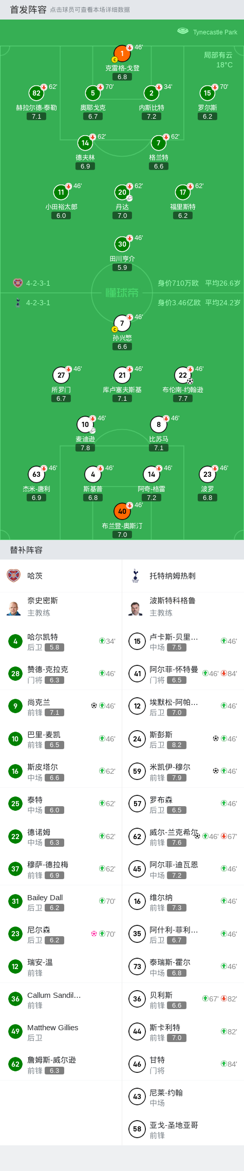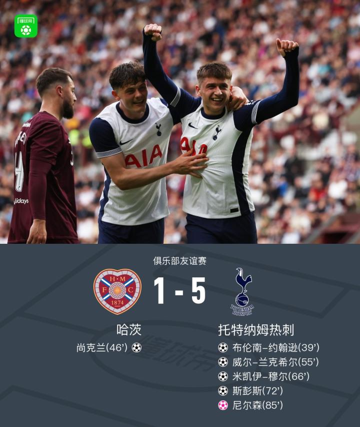 在一场俱乐部友谊赛中,哈茨迎战托特纳姆热刺。上半场,麦迪逊助攻布伦南-约翰逊推射破门。下半场,尚克兰扳平比分,威尔-兰克希尔低射破门,穆尔内切破门扩大领先优势,维尔纳助攻斯彭斯铲射建功,比赛最后时刻,阿什利-菲利普斯补射造成尼尔森自摆乌龙,最终,热刺5-1大胜哈茨。
