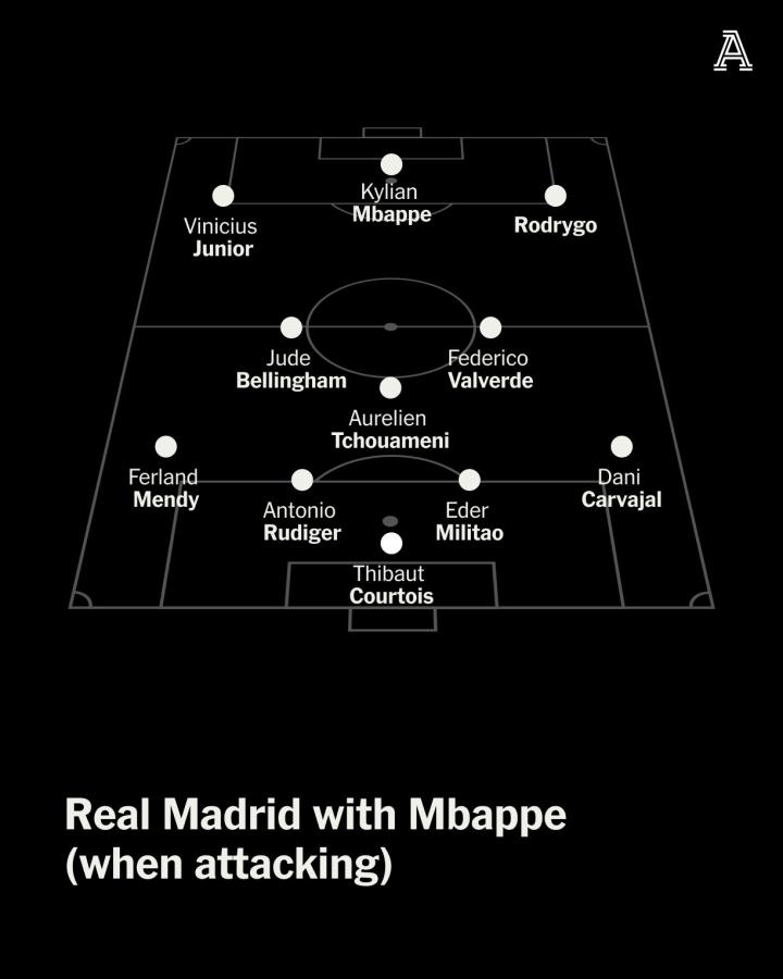 在进攻时,阵型将类似于4-3-3。从右到左,前线预计由罗德里戈、姆巴佩和维尼修斯组成,身后是由巴尔韦德、楚阿梅尼和贝林厄姆组成的中场;