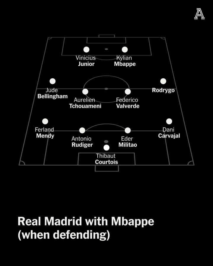 姆巴佩加盟后,皇马的战术将根据进攻或防守切换成两种阵型。