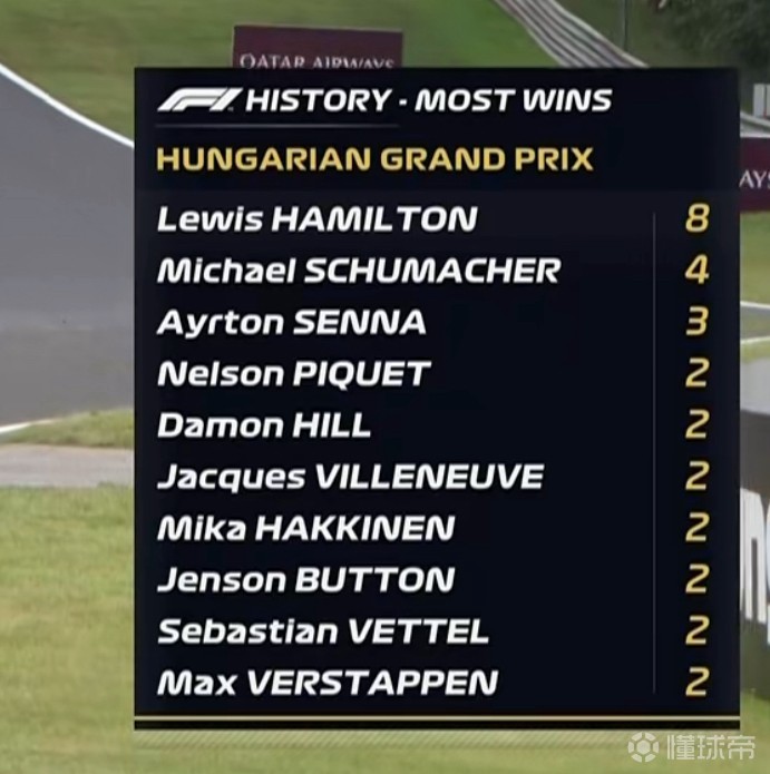 F1官方给到了匈牙利大奖赛获胜次数排行榜:汉密尔顿8次夺冠位居榜首!