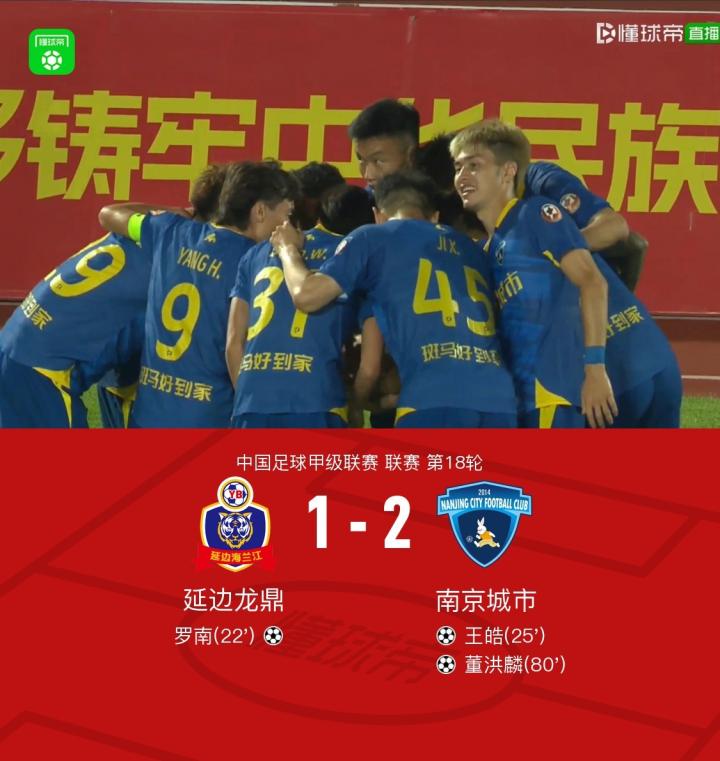 北京时间7月20日19:00,在中国足球甲级联赛第18轮的比赛中,延边龙鼎主场迎战南京城市。上半场比赛中,罗南率先破门,为主队取得领先,随后王皓迅速还以颜色,将比分扳平;下半场,刘家辉送出精妙助攻,董洪麟成功破门反超比分。最终,南京城市以2比1战胜延边龙鼎。