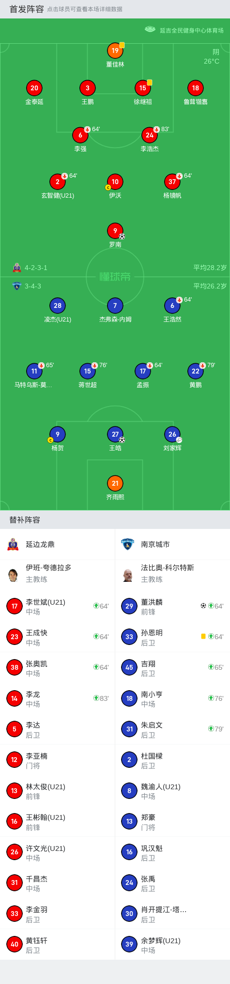 第80分钟,刘家辉送长传,董洪麟小角度抽射将比分反超,延边1-2南京
