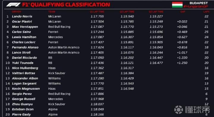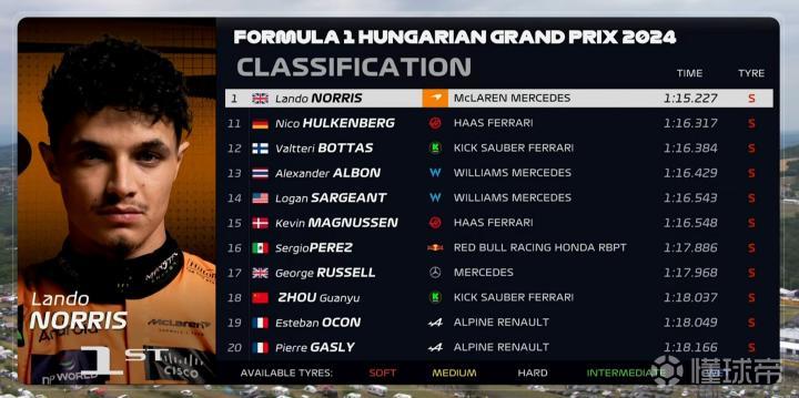 F1匈牙利排位赛:诺里斯夺杆,维斯塔潘第3,佩雷兹Q1退赛