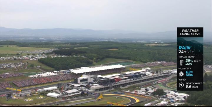 根据现场的天气预报,本场比赛前出现了降雨的情况,赛道上整体有些湿滑,气温也相对较低,这也将给选手们的第一节排位赛带来考验。
