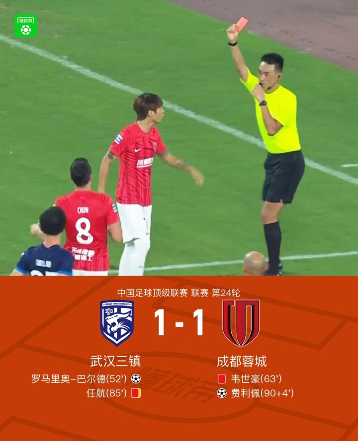 【三镇1-1成都,韦世豪报复性踢人染红,罗马里奥、费利佩建功】