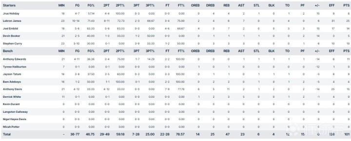 美国队此役5人得分上双,詹姆斯出战23分钟,投篮14中10,得到25分6篮板7助攻4失误;恩比德6中5得到14分7篮板,库里10中3得到10分3篮板3助攻,戴维斯12中4拿下15分11篮板,爱德华兹11中4得到11分。