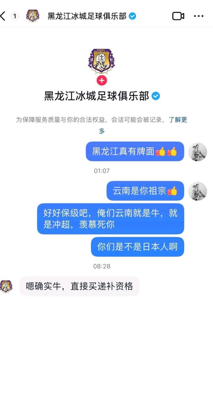 此外,根据我懂用户@Vocci 的聊天记录,黑龙江俱乐部官方在回应球迷带有辱骂意味的私信时直言云南玉昆“直接买递补资格”。