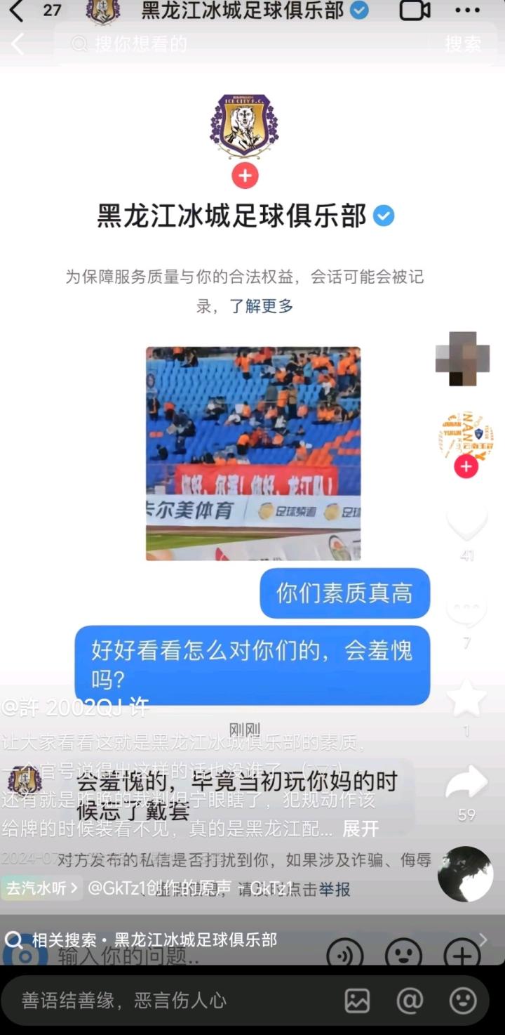 而在比赛结束后,有一名云南球迷私信黑龙江冰城官方抖音号:“你们素质真高,好好看看怎么对你们的,(你们)会羞愧吗?”