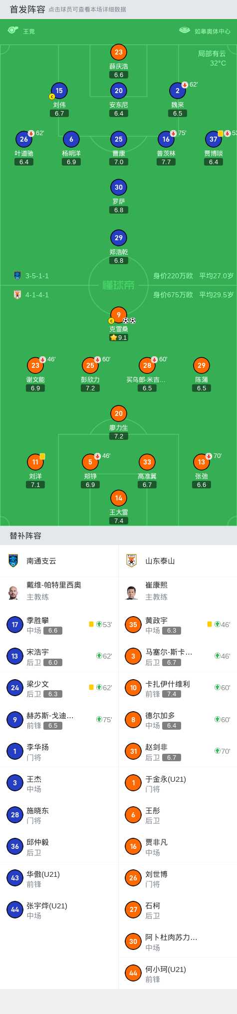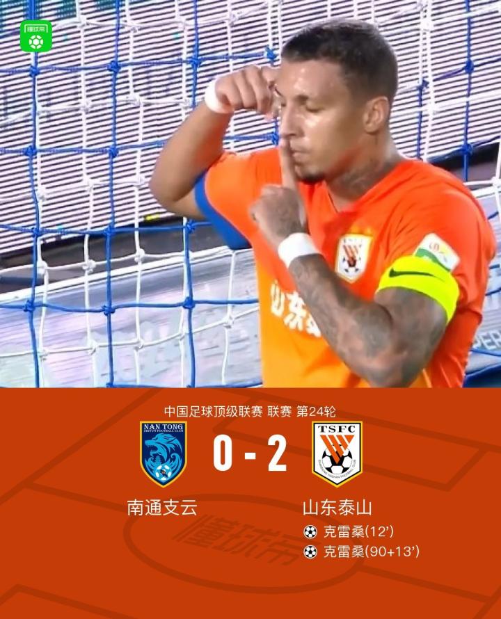 北京时间7月21日,中国足球顶级联赛第24轮,南通支云主场迎战山东泰山。上半场谢文能挑射打高,克雷桑禁区倒挂金钩破门,随后克雷桑半场吊射稍稍打高,下半场季胜攀、杨明洋打门造险,卡扎伊什维利打门被薛庆浩神勇扑出,克雷桑最后时刻兜射锁定胜局。最终,山东泰山以2比0战胜南通支云。