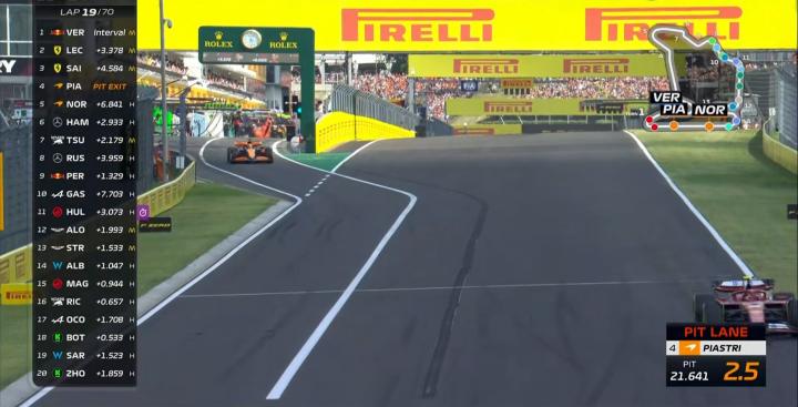 第19圈!皮亚斯特里也选择进站完成一停!出来后落到诺里斯的身前!