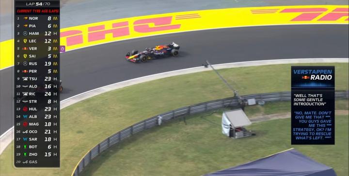 第54圈!维斯塔潘在TR中持续吐槽今天车队的策略!他本人非常的愤怒!
