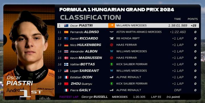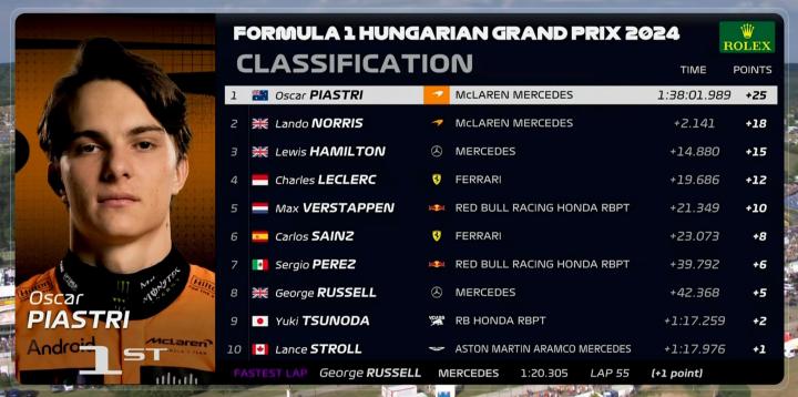 F1匈牙利站正赛:皮亚斯特里生涯首冠,诺里斯、汉密尔顿二三