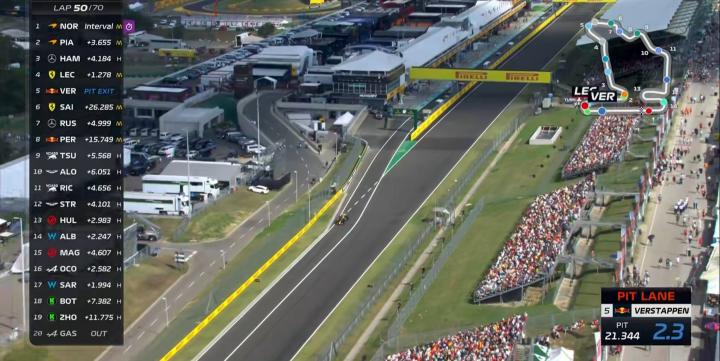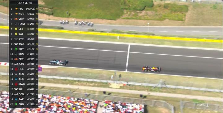维斯塔潘晚刹车被推出赛道后,在1号弯外加速获利!超越诺里斯上到P2!