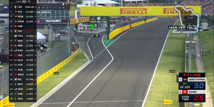 第22圈!维斯塔潘&赛恩斯选择进站执行一停!维斯塔潘落到P5!赛恩斯落到P9!