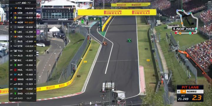 第46圈!诺里斯选择进站!出来后落到汉密尔顿身前!