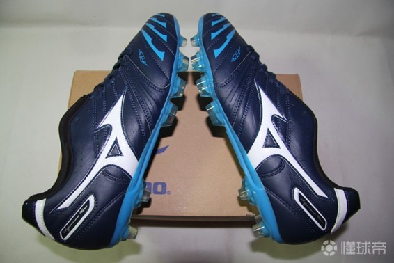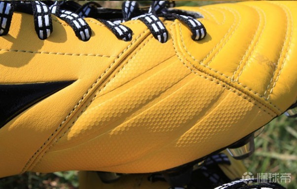 第一代索尼克最值得称道的,便是他对外宣称的“全袋鼠皮”配置。虽然有吹嘘的成分,毕竟后跟和Logo部分不是袋鼠皮,但是这鞋的袋鼠皮覆盖率也达到了75%以上,可谓相当的厚道!前掌主要发力部分的袋鼠皮非常柔软且厚实,传停控兼抽射俱佳。再加上之前提到过的与经典Morelia相似的仅有横向走线,鞋头定型饱满,脚型兼容性也十分出色。另外就是鞋头略微上扬的设计,虽不是太明显,但这在一定程度上也增加了球鞋的舒适度,从图中可窥见一斑。以上是其真皮部分的描写,此鞋的科技含量则最大的体现在了其鞋底的减震上。Wave减震技术,是Mizuno足球鞋赖以生存的技术,也是市场上为数不多的鞋底减震技术。2003年备受好评的Morelia Wave系列,之前在下文章中提到过的,也正是用了这个减震出色的大底。