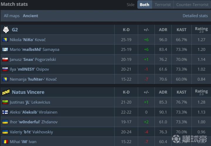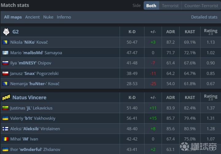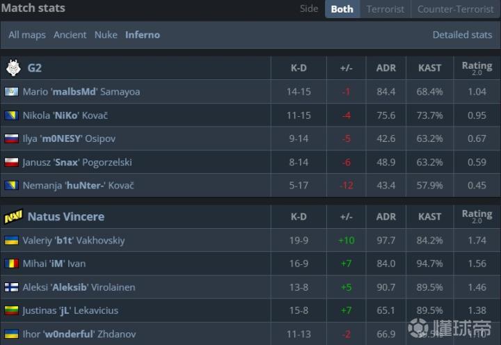 在Nuke上NAVI展现出了更优秀的战术储备和团队协同,天生赢家在下半场轻松化解了G2的进攻,以一波7-0带走图二。NAVI五人rating均过1,jL贡献了100.4的adr,主宰了核子的内场。
