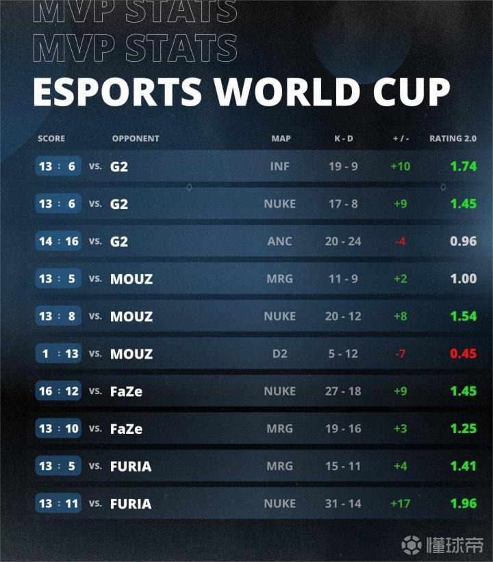 而Niko最终以10张地图场均1.35的rating被HLTV评为赛事EVP,同时被利雅得电竞世界杯官方评为赛事MVP,并给予5万美元奖金。