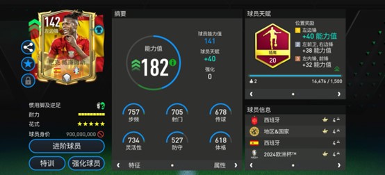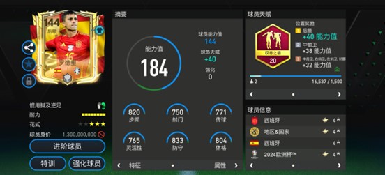 欧洲杯甄选球员罗德里基础能力值144,配备了叹息之墙天赋。实战中,罗德里是一名典型的“B2B”中场,他在攻守两端都有稳定的贡献。进攻端,罗德里在中场的长短传准确度俱佳,由守转攻时可以作为中场过渡点出球,充当节拍器的角色。得分方面,罗德里在前插后的爆射强悍,能在禁区外围给对手防线施压,是球队破密集防守的利器。防守端,罗德里的一对一单防表现出色,近身干扰强度和强力抢断的破坏效果俱佳。防长传时,他优秀的选位意识也能让他完成预判拦截。