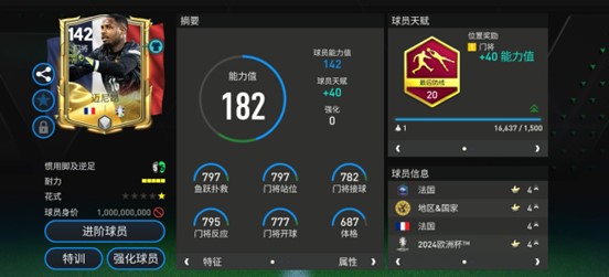 迈尼昂的欧洲杯甄选球员基础能力值达到142,配备了最后防线天赋。实战中,迈尼昂是一位扑救反应快,进攻端出球能力极佳的全能门将。进攻端,迈尼昂摘下皮球后的大力手抛球,以及地面长传的大范围转移都能越过对手的中前场防守,精准的衔接到锋线队友,提升球队反击效率。扑救方面,迈尼昂的选位意识出色,扑救反应极快,对手内切打门时,迈尼昂会根据对手射门角度的变化调整站位,同时他的手控球效果稳定。在防传中时,迈尼昂也能准确判断落点,快速出击完成拦截。