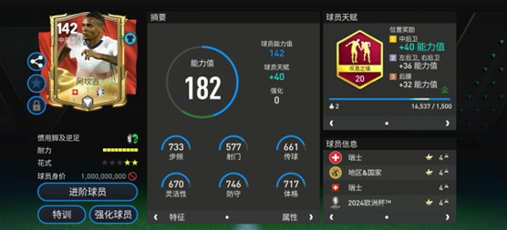 欧洲杯甄选球员阿坎吉基础能力值142,配备了后卫热门天赋叹息之墙。实战中,阿坎吉是一名防守表现稳定,对抗能力出色的中后卫。地面防守中,阿坎吉的跑动拦截意识出色,他的冲抢凶猛,正面防守的破坏效果极佳,同时他还有着一流的一对一单防表现,近身干扰强度十足。进攻端,阿坎吉的后场长传出球精准,角球进攻中,虽然阿坎吉的身高并没有太大优势,但是他的弹跳充分,对球落点的预判精准,能及时用强悍的卡位占据有利位置,有效避开对手的密集防守。