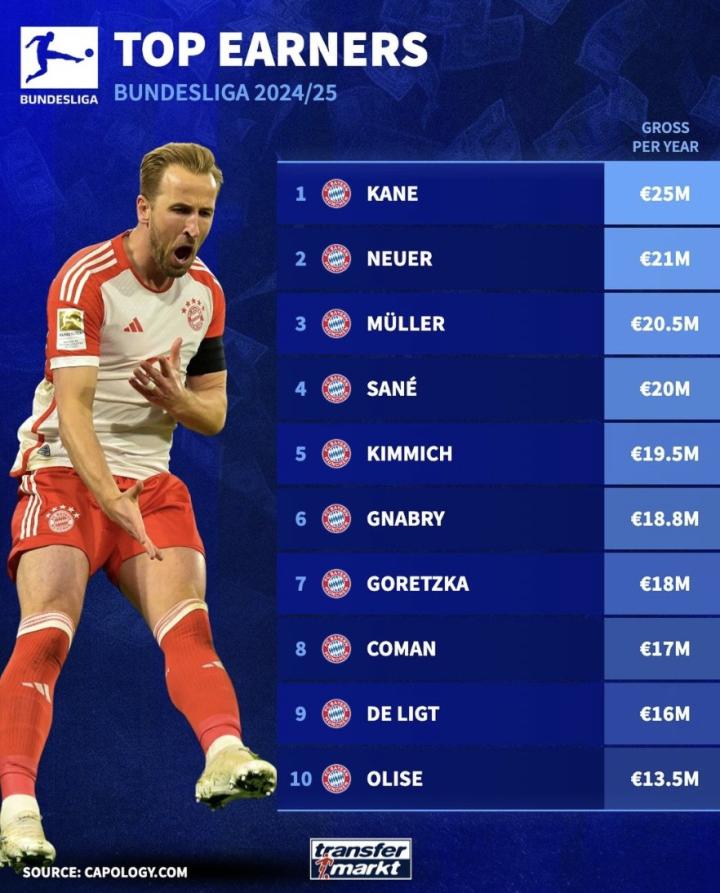 最近,德国转会市场列出了德甲球员在2024/25赛季的年薪榜,其中排名前10的球员均来自拜仁慕尼黑。凯恩、诺伊尔、穆勒位列前三。