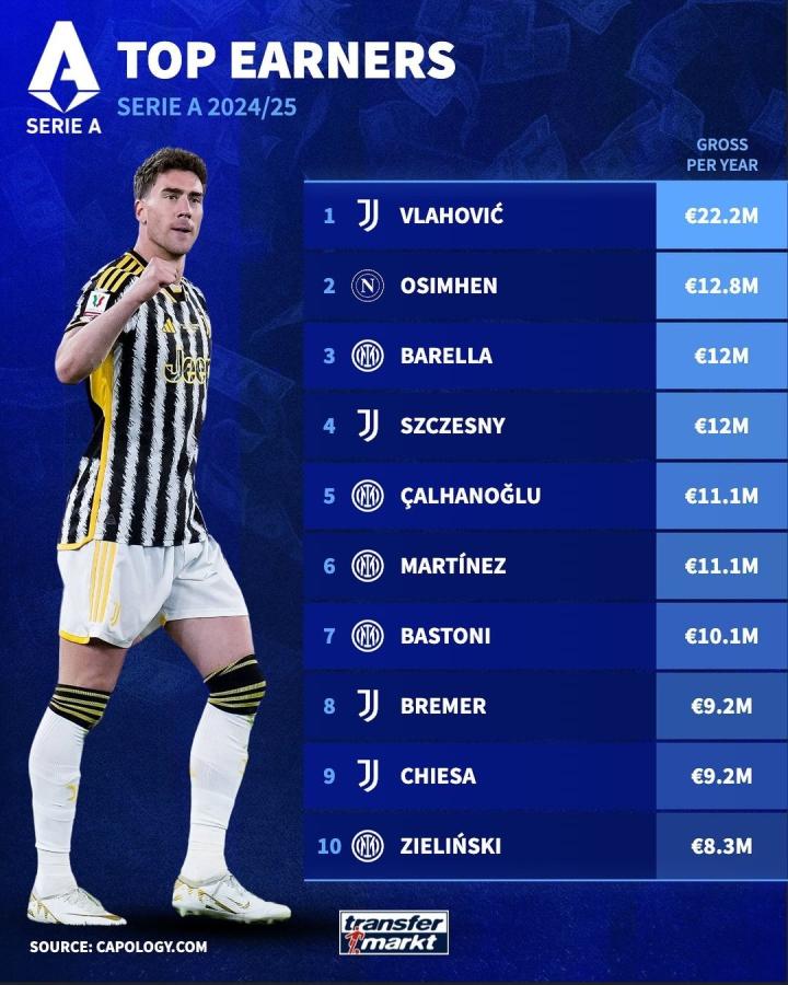 最近,德国转会市场列出了意甲联赛球员在2024/25赛季的税前年薪排行榜。