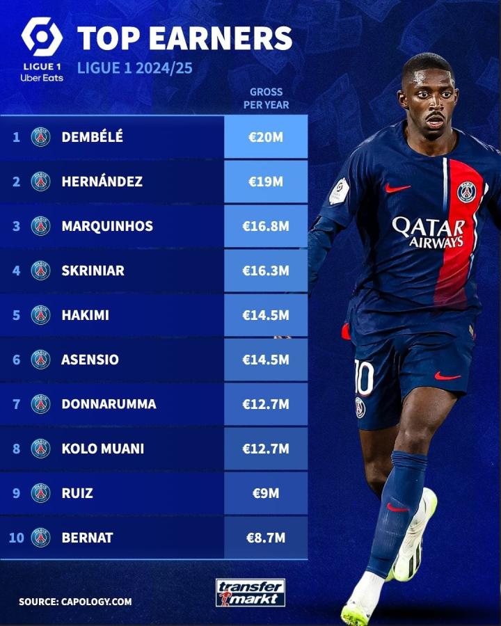 德转列法甲球员年薪榜:登贝莱位列榜首,前10均为巴黎球员