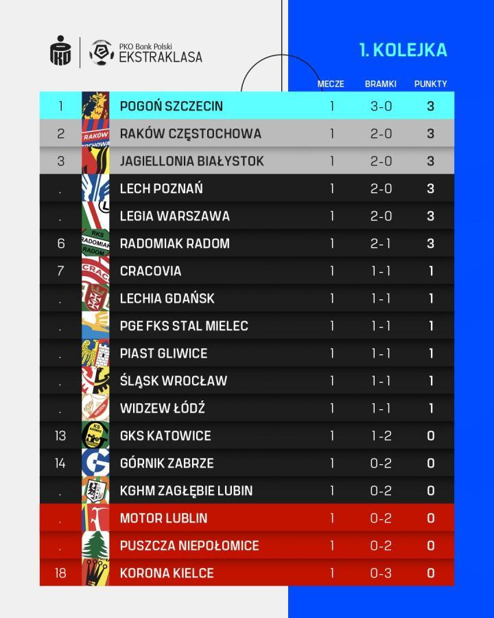 当地时间7月22日,2024/25赛季波兰足球超级联赛第1轮的比赛全部结束。卫冕冠军雅盖隆赢下揭幕战,希隆斯克战平莱希亚,莱吉亚、莱赫、拉库夫均取得开门红。