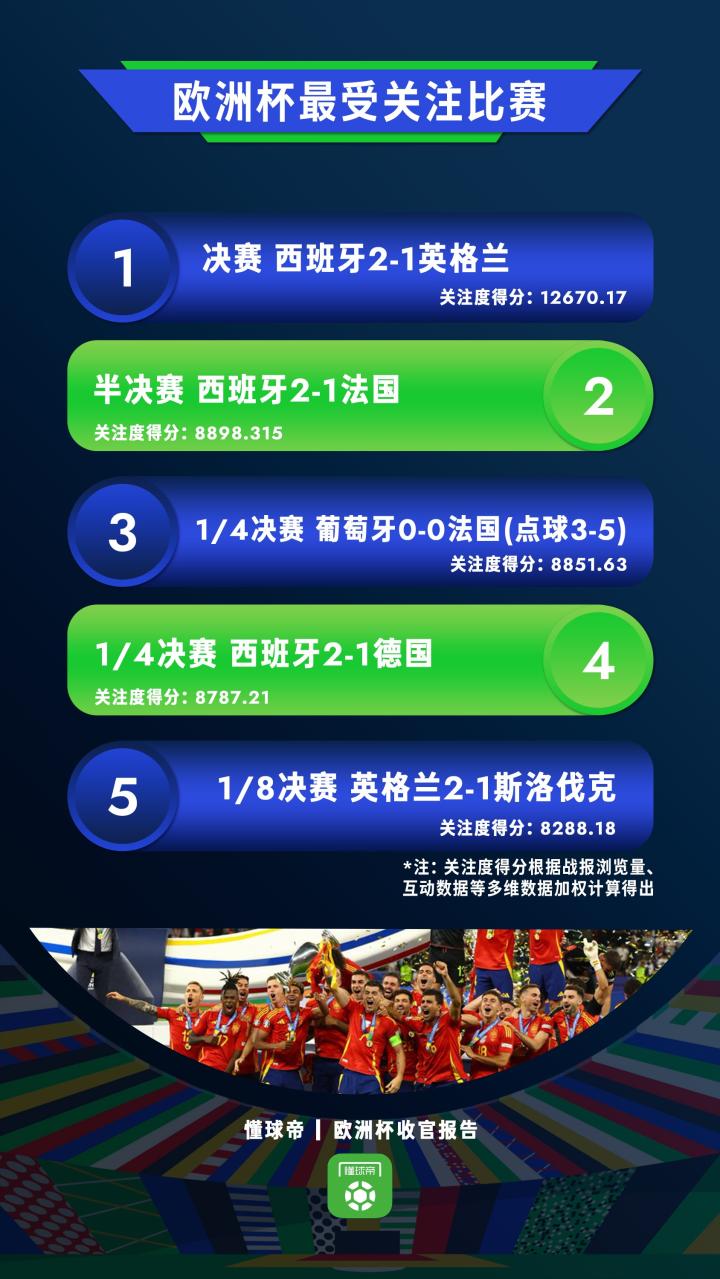 我们通过对欧洲杯期间比赛进行了数据分析,通过对比新闻浏览量、用户互动数据、曝光度等多重数据并对数据加权计算,得到了本届欧洲杯最受关注的五场比赛。