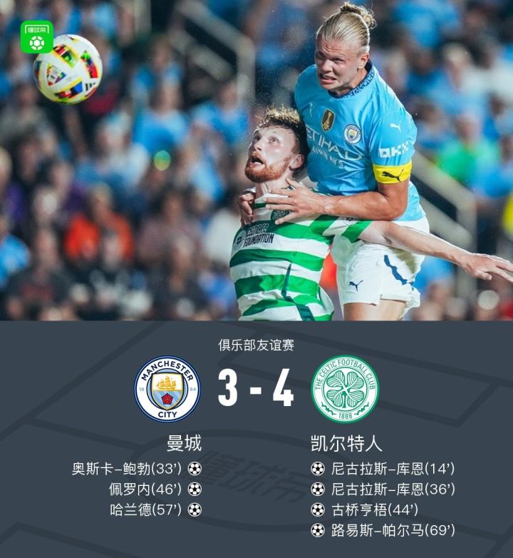 曼城3-4凯尔特人,哈兰德头球破门,库恩梅开二度