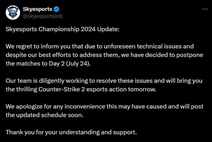 随后赛事官方表示:“我们很遗憾地通知您,由于不可预见的技术问题,尽管我们尽了最大努力解决这些问题,但我们决定将比赛推迟到第2天(7月 24 日)。 我们的团队正在努力解决这些问题,并将在明天为您带来激动人心的CS2电子竞技比赛。我们对由此造成的任何不便深表歉意,并将很快发布更新后的时间表。 感谢您的理解和支持。”