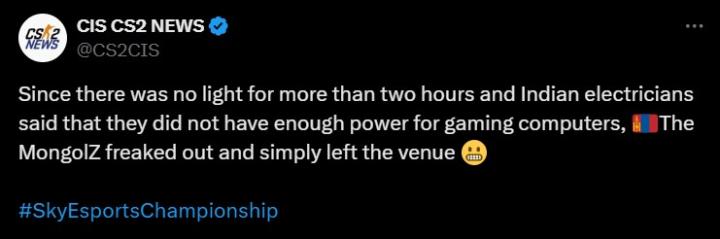 首个比赛日,The Mongolz对阵True Rippers的BO1进行至6-11时,场地出现电力问题,印度电工表示他们没有足够的电力供游戏电脑使用,MongolZ惊慌失措地离开了场地。
