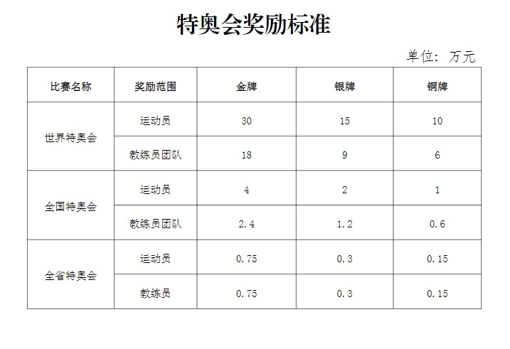 残奥会奖励实行“同级别比赛同标准奖励”;世界特奥会、全国特奥会、全省特奥会冠军分别奖励30万元、4万元、0.75万元。