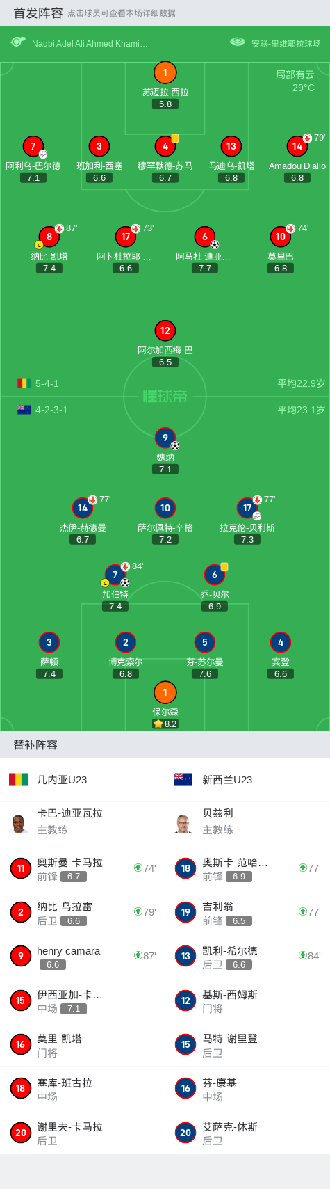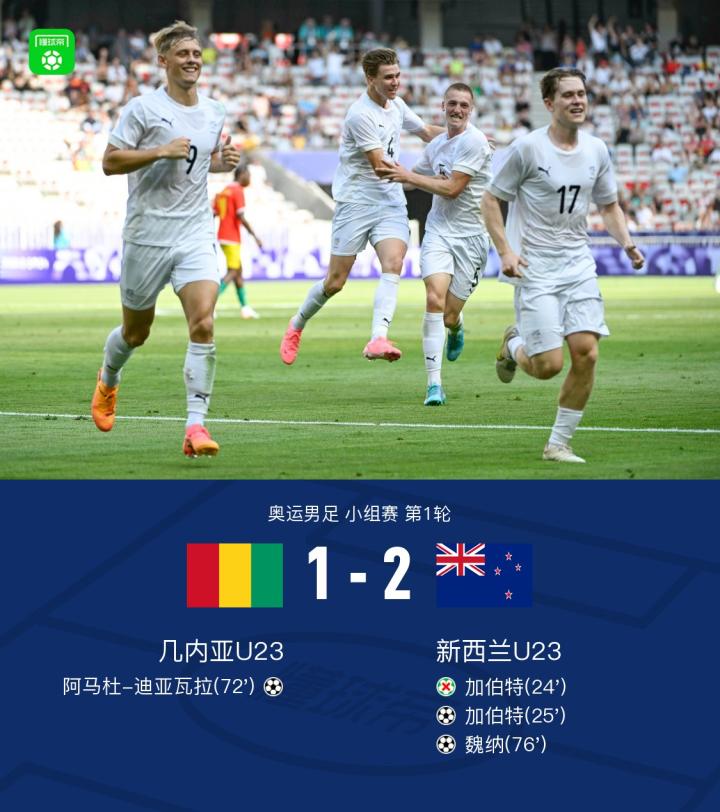 北京时间7月24日,奥运男足小组赛第1轮,几内亚国奥迎战新西兰国奥。上半场,萨顿造点,加伯特主罚点球不进。仅过了一分钟加伯特将功补过,前场抢断成功射门得分。下半场,迪亚洛越位在先,阿利乌-巴尔德进球被吹无效。阿利乌-巴尔德弧顶射门得分将比分扳平,仅过了2分钟魏纳接拉克伦-贝里斯的横传破门得分,再次将比分超出。最终新西兰国奥2-1战胜几内亚国奥。