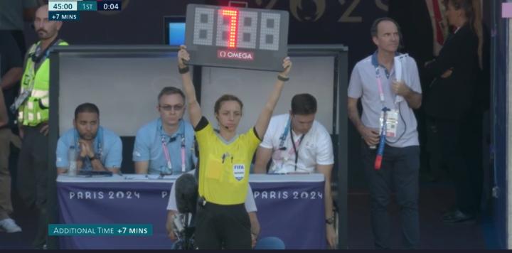 第45分钟,第四官员举牌,本场比赛上半场补时7分钟
